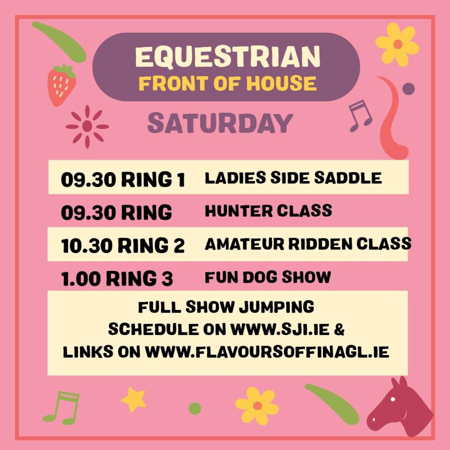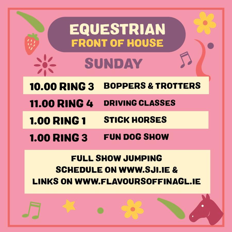 - Equestrian Showcase: Hosted by Fingal Harriers, professional Irish horse riders will compete in top competitions including the Mervue Amateur, speed classes, RDS Dublin Horse Show qualifiers and the Joe Duffy BMW National Grand Prix.