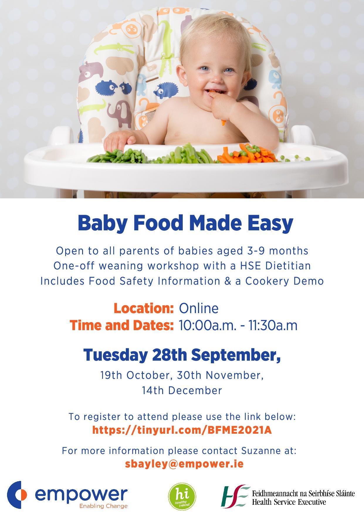 Baby Food Made Easy is a one session workshop for parents/guardians of babies aged 3-9 months, who are ready to start spoon-feeding or may have already started the weaning process. The information provided during the workshop is in accordance with the current guidelines from the Department of Health and Children.