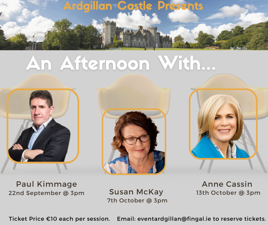 Ardgillan Castle Presents An Afternoon with Paul Kimmage Friday 22nd September. Susan McKay Saturday October 7th and Anne Cassin Friday October 13th, all at 3pm
