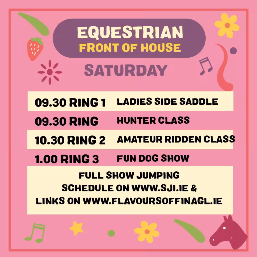 - Equestrian Showcase: Hosted by Fingal Harriers, professional Irish horse riders will compete in top competitions including the Mervue Amateur, speed classes, RDS Dublin Horse Show qualifiers and the Joe Duffy BMW National Grand Prix.