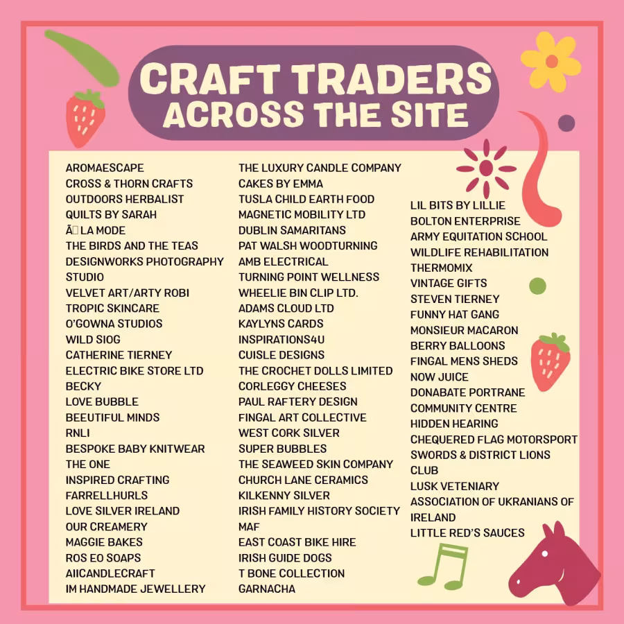 - Horticulture Tent: Run by the Fingal Horticultural Society, offering flower and gardening demonstration, 80+ competition classes (flowers, veg, home baking), hands-on workshops, and expert gardening advice.