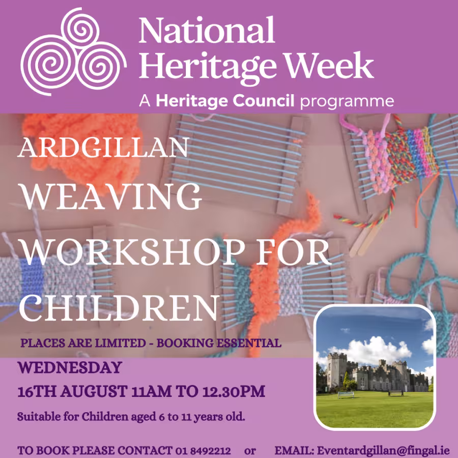 Ceardlann Fíodóireachta do Pháistí, Dé Céadaoin an 16 Lúnasa idir 11rn agus 12.30in. Tá áirithint riachtanach ag rPhost [email protected] ar ghuthán ag 01 8492212