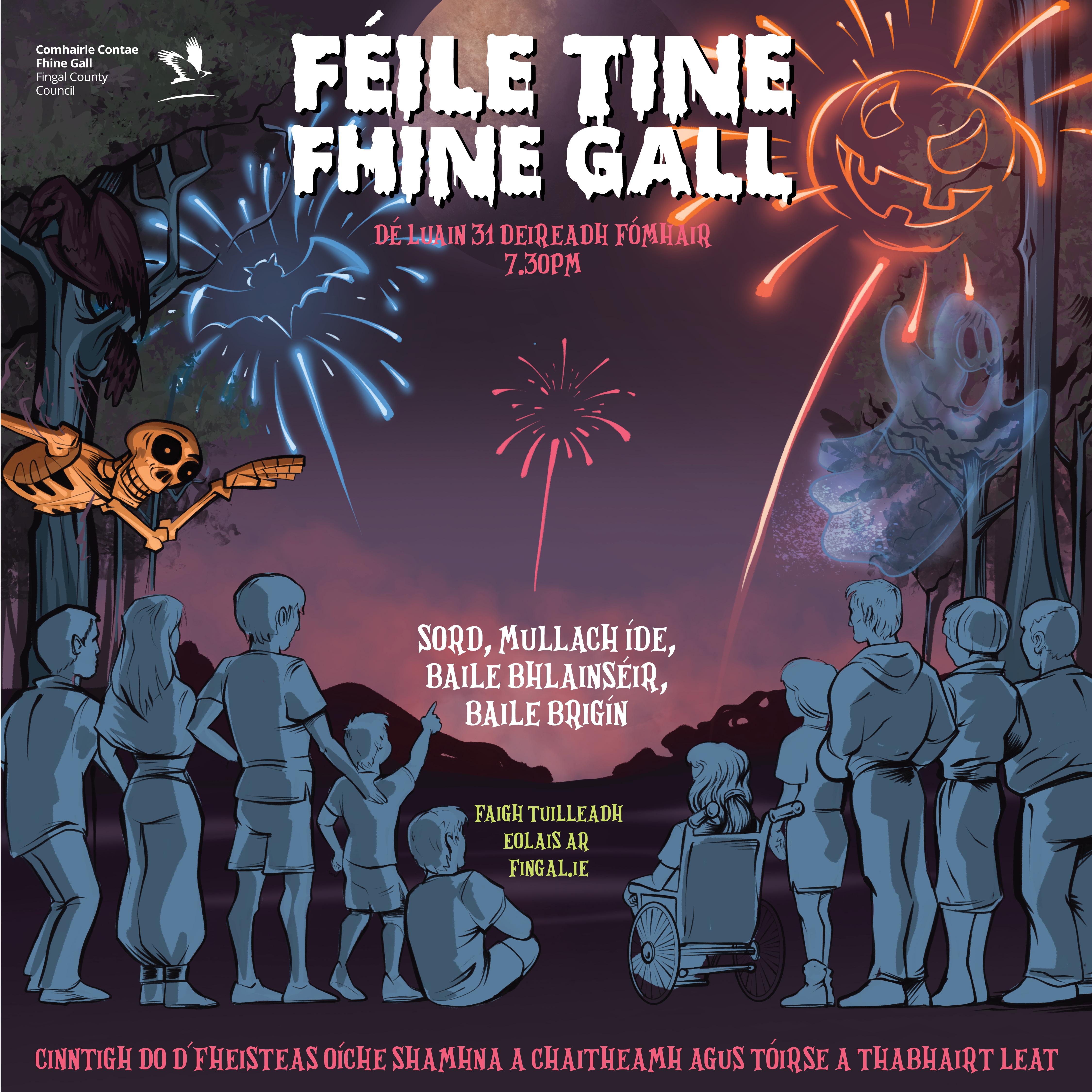 Tá Féile na Tine Fhine Gall le teacht ar ais freisin, le himeachtaí saor in aisce ar an Luan, 31 Deireadh Fómhair i bPáirc Bhaile Shoird, i gCaisleán Mhullach Íde, i bPáirc na Mílaoise agus i gCaisleán Bhrí Mhór. Tosóidh Dioscó Uaigneach ar a 7.00pm agus tiocfaidh taispeántas tinte ealaíne draíochtúil ina dhiaidh sin agus é beartaithe le pléascadh sa spéir na hoíche ar a 7:30pm i ngach ceithre áit. Le tuilleadh eolais a fháil, téigh le do thoil ar: Féile Tine Fhine Gall