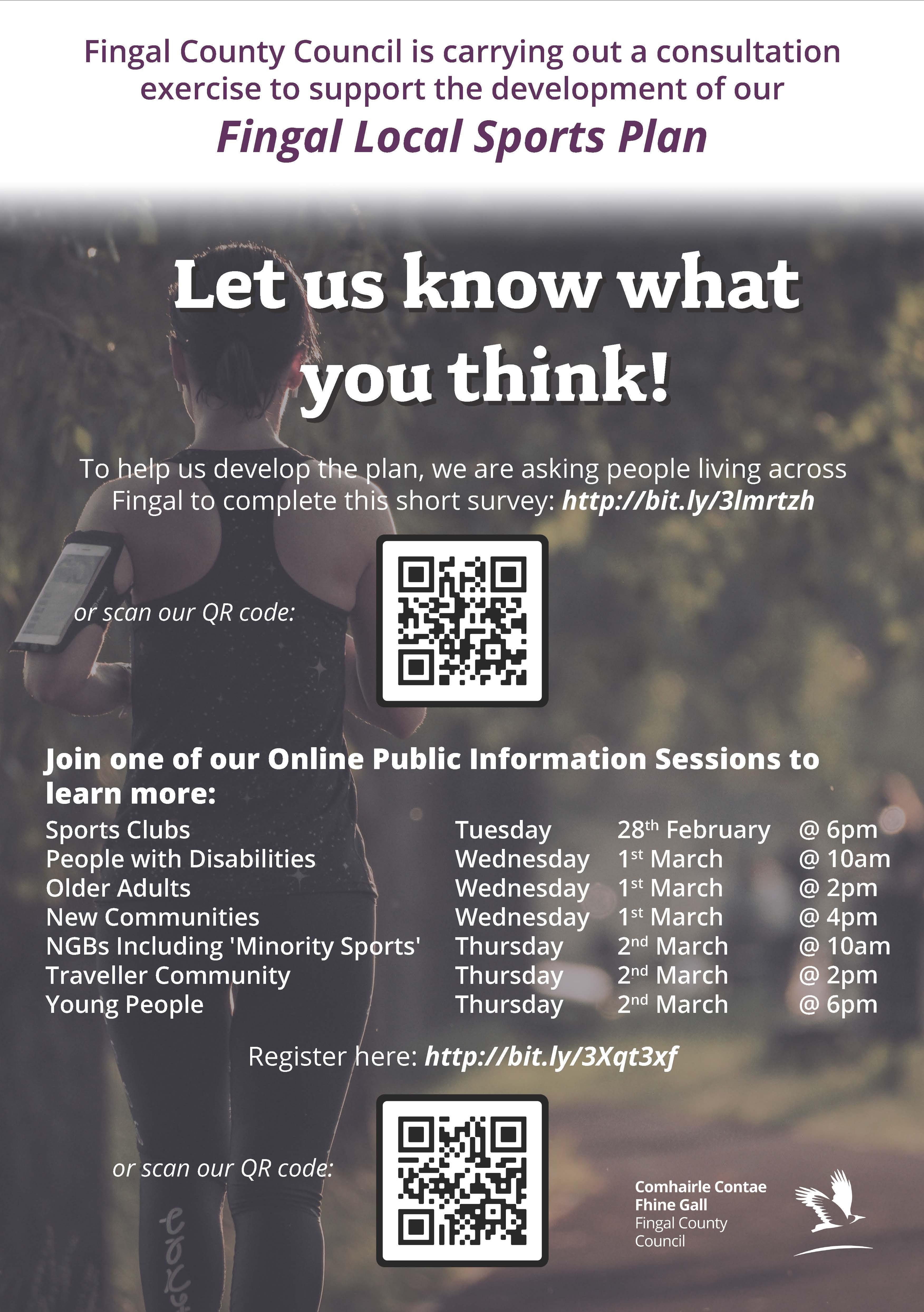 Principal Sports Officer in the Community and Sport Division of Fingal County Council, Gerard Reardon, commented: “The consultation is open to all and there are two ways to have your say. You take part in our Survey or participate in one of our online workshops or do both. Our aim is to help create opportunities for all our citizens to participate in lifelong patterns of involvement in sport, in a county where sport is at the heart of society and creates a positive impact on individuals and communities. I would urge all members of the public and those involved in sporting organisations and other groups to take part in this consultation and help shape the future of Sport in Fingal”.